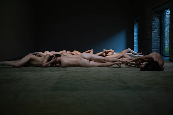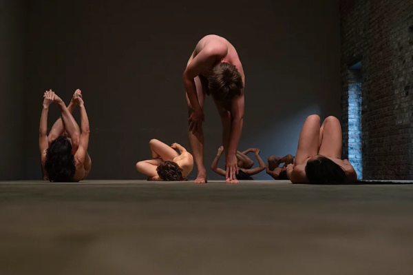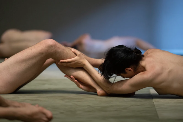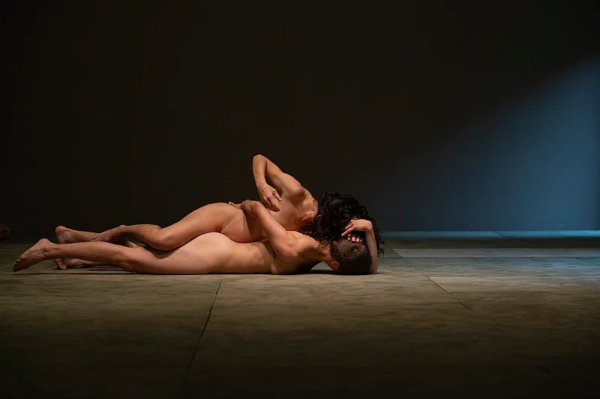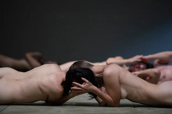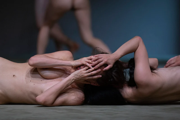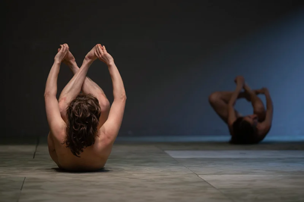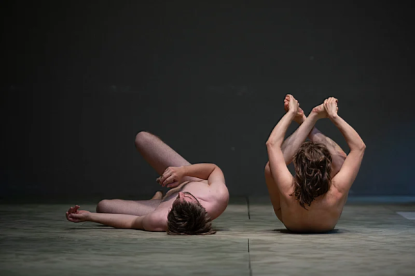 Even the introduction is as simple as it is magical. One by one, coming from the audience, the performers at the edge of the stage slip out of their shorts and T-shirts without much fanfare and nestle broadly onto – or rather into – the dance floor at the back of the stage. Floor and body seem to merge, become one. In fact, the fourth or fifth body creates the image and feeling of a landscape. Near and far, above and below, in front and behind, all made of hair and skin. A landscape that initially moves towards the audience almost imperceptibly. Bodies that meet and thus become hills and mountains, pile up and form valleys at the same moment, only to disappear again into the whole.