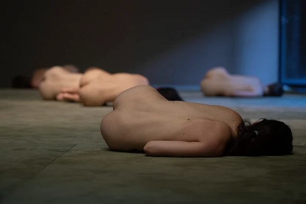Schon der Einstieg ist so simpel wie magisch. Nach und nach, aus dem Publikum kommend, schlüpfen die Performerinnen an der Bühnenkante ohne viel Tamtam aus ihrer Schort und ihrem T-Shirt und schmiegen sich am hinteren Ende der Bühne ganz breit auf – oder besser in – den Tanzboden. Boden und Körper verschmelzen scheinbar, werden Eins. Tatsächlich entstehen mit dem vierten oder fünften Körper das Bild und das Gefühl einer Landschaft. Nah und fern, darüber und darunter, vor und hinter, alles aus Haar und Haut. Eine Landschaft die sich anfangs kaum merklich auf das Publikum zu bewegt. Körper, die einander begegnen und so zu Hügeln und Gebirgen werden, sich auftürmen und im gleichen Moment Täler formen, um dann doch wieder im Ganzen zu verschwinden.