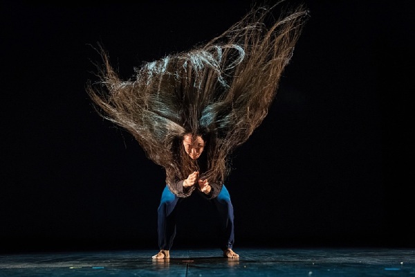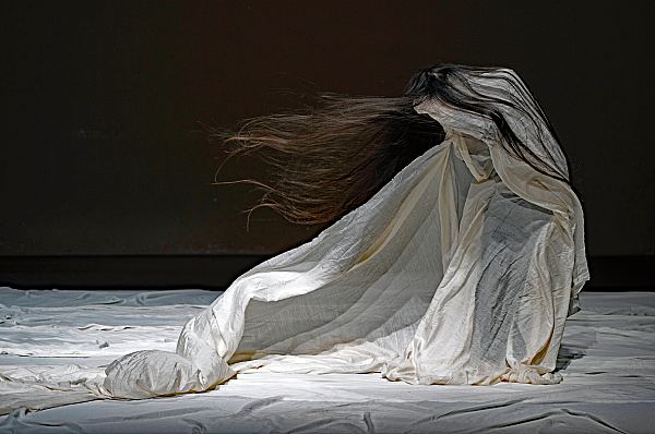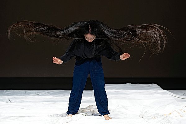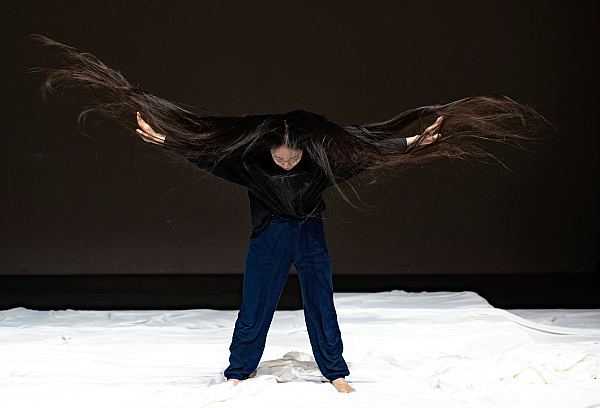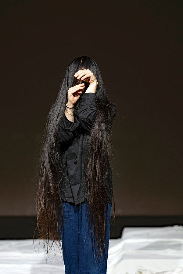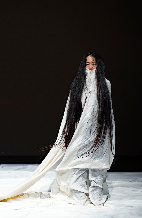 Der Boden der kleinen Bühne ist mit schneeweißen Stoffen ausgelegt. Nebelschwaden hängen in der Luft. Am vorderen Bühnenrand steht Tänzerin Aya Toraiwa und blickt in die neugierigen Kindergesichter im Publikum. „Ich bin Yuki Onna – die Schneefrau“ ertönt eine Stimme aus den Lautsprechern. Die Tänzerin öffnet ihre knielangen schwarzen Haare, breitet sie vor sich auf dem Boden aus und beginnt über die weiße Bühne zu rollen. Während sie sich spielerisch von rechts nach links wälzt, ruft sie mit fröhlicher Stimme Worte und Silben auf Englisch, Deutsch und Japanisch. Schräg vor mir dreht sich ein Kindergartenkind zu seinen Freund*innen um und erklärt ihnen: „Das sind normale Haare, denn wenn es Kunsthaare wären, würden sie ab, ab, ab fallen.“ Die Haare bleiben im Fokus des Stückes. Die Tänzerin versteckt sich hinter ihnen, schwingt sie in großen Kreisen. Die Beobachtung der Strähnen hat eine fast hypnotische Wirkung, als müssten sie den physikalischen Gesetzen von Schwerkraft und Zeit nicht folgen. Wenn die schwarzen Locken auf dem weißen Boden liegen, denke ich an Wurzeln oder tiefe Risse in der Schneelandschaft. Fährt Aya Toraiwa mit den Fingern durch die vorm Gesicht hängenden Haare, werden diese zu Zähnen eines gruseligen Monsters.